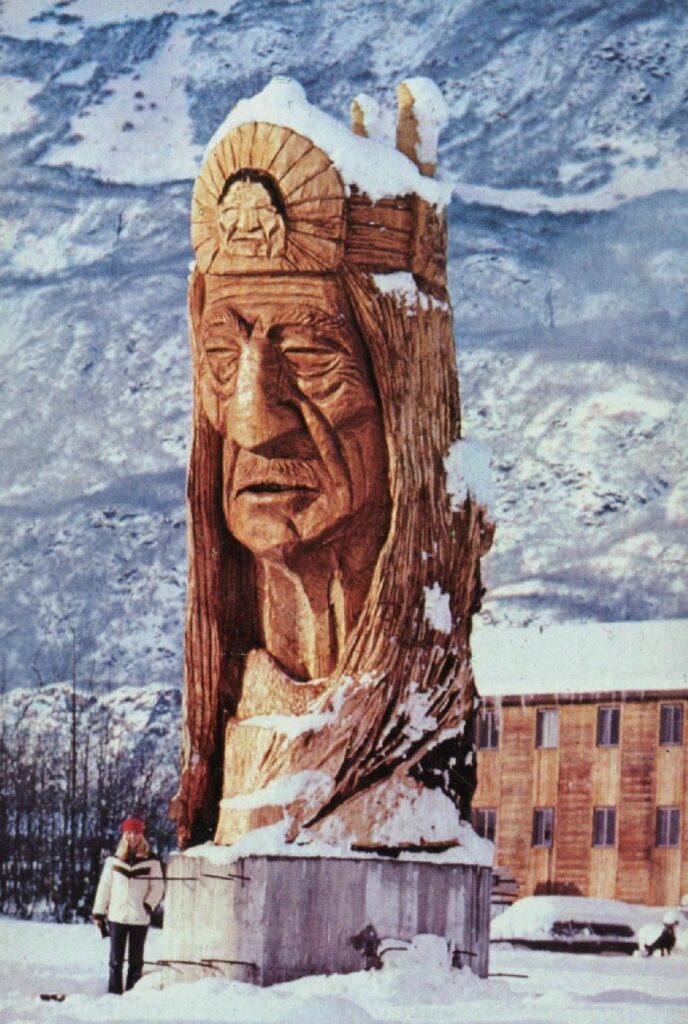 This Whispering Giant is pictured on a postcard, dedicated in October 0f 1981. The material is Sitka spruce and the Lakota Sioux Nation contributed to the sculpture.