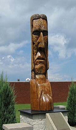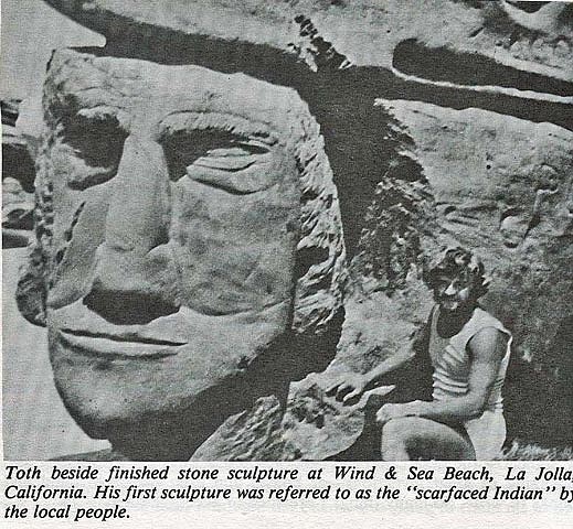Peter “Wolf” Toth is an American sculptor born in Hungary, who immigrated to Ohio and studied art at Ohio University. Beginning in 1971, he created a series of large sculptures to honor Native Americans. His first was made of stone, carved into a sandstone cliff in La Jolla, California, a six-foot-high Native American head. It took him three months.