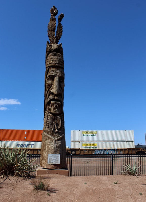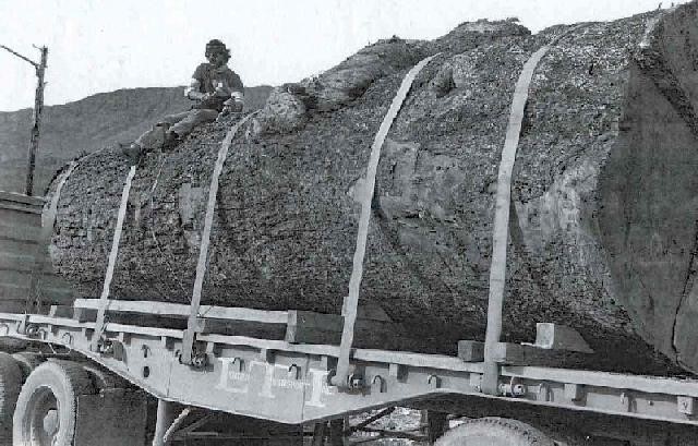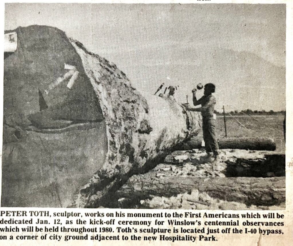 From the Winslow Mail, Thursday, January 3, 1980, Peter Toth carving a 3000 pound log Ponderosa pine to create this 20 foot tall statue.